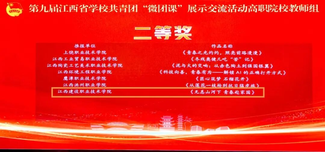 12月6日,第九届江西省学校共青团 “微团课” 展示交流活动圆满收官。我院黄姝蓓老师凭借精心打磨的作品《无恙山河下 青春赴家国》,在全省各级各类学校的激烈角逐中脱颖而出,成功斩获高职院校教师组二等奖,为学校赢得了宝贵荣誉!