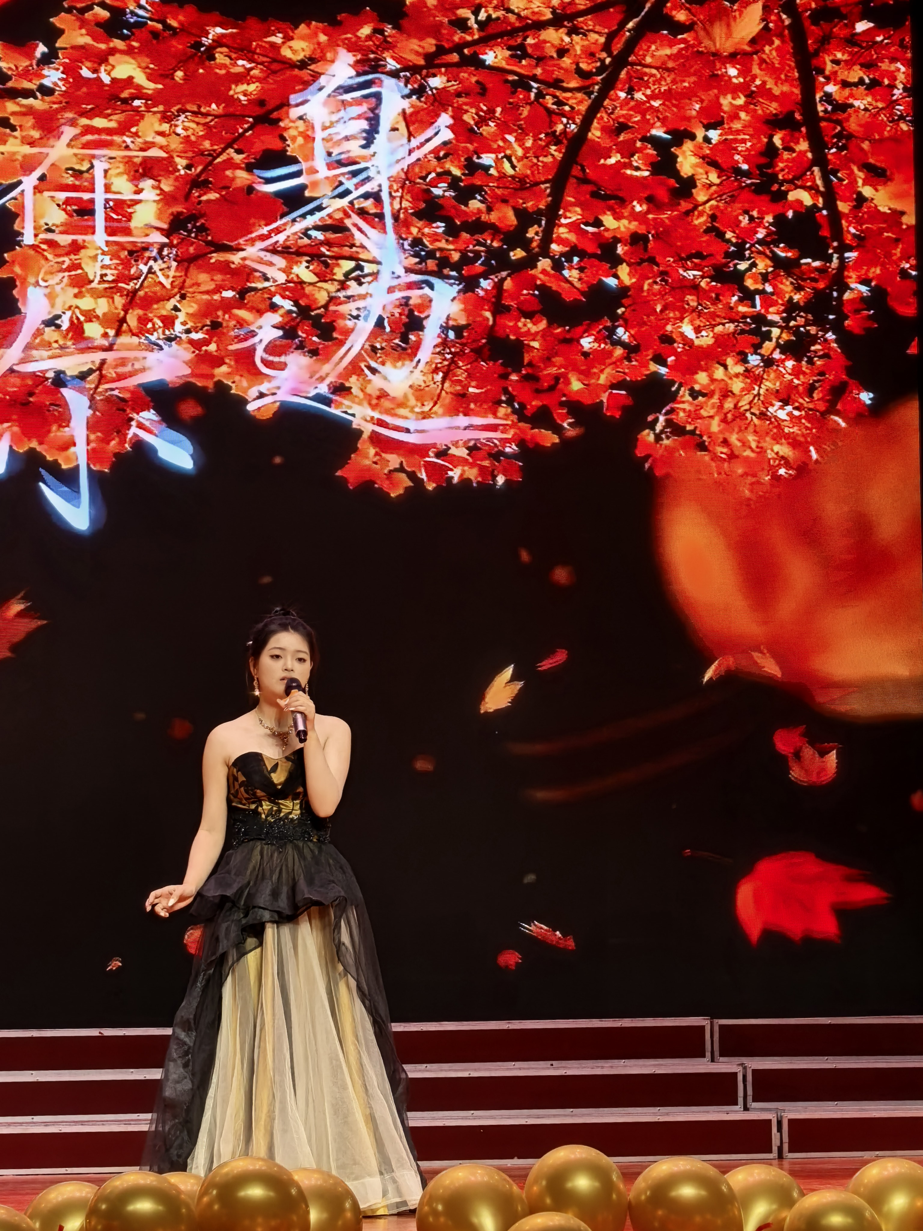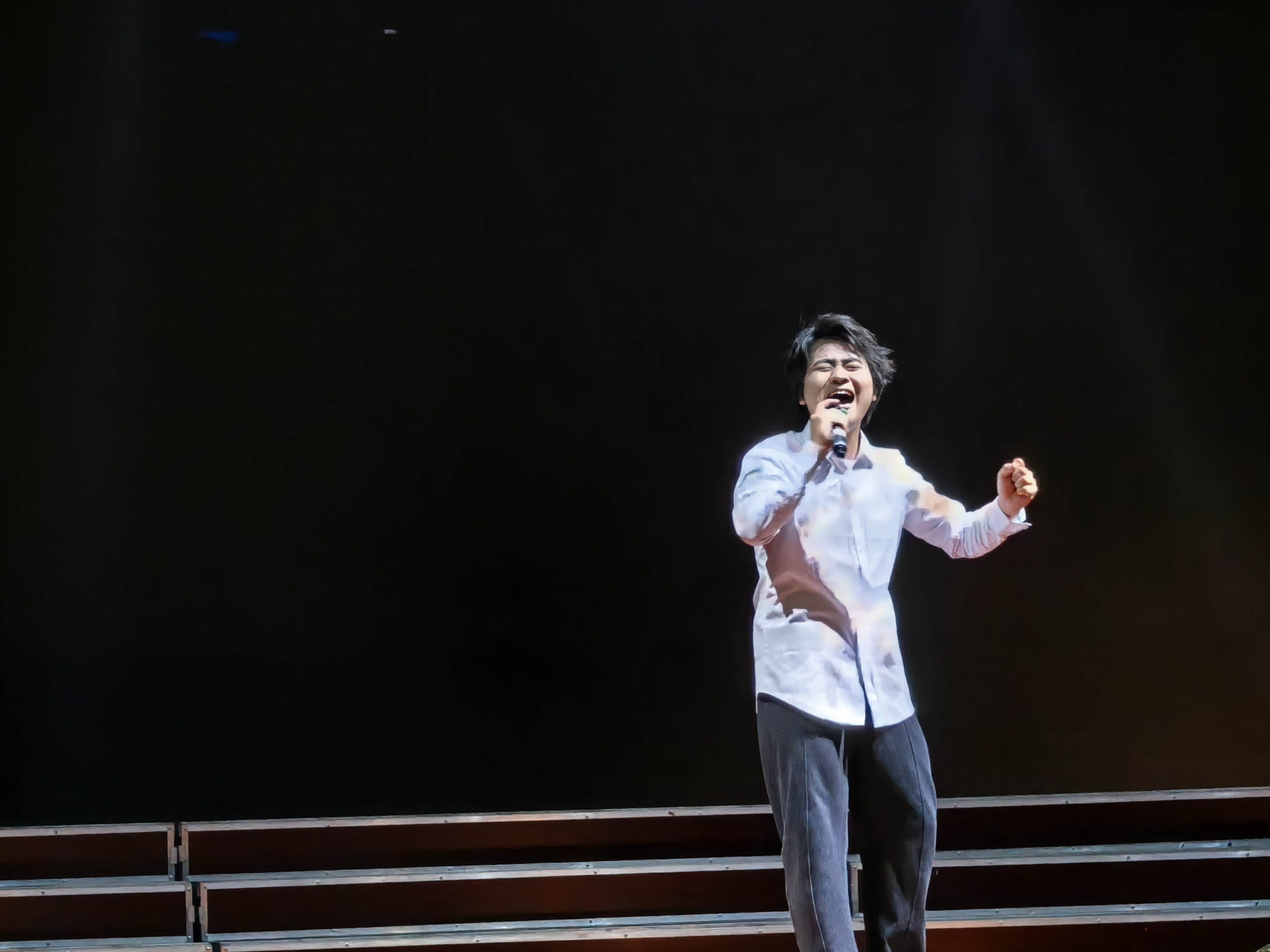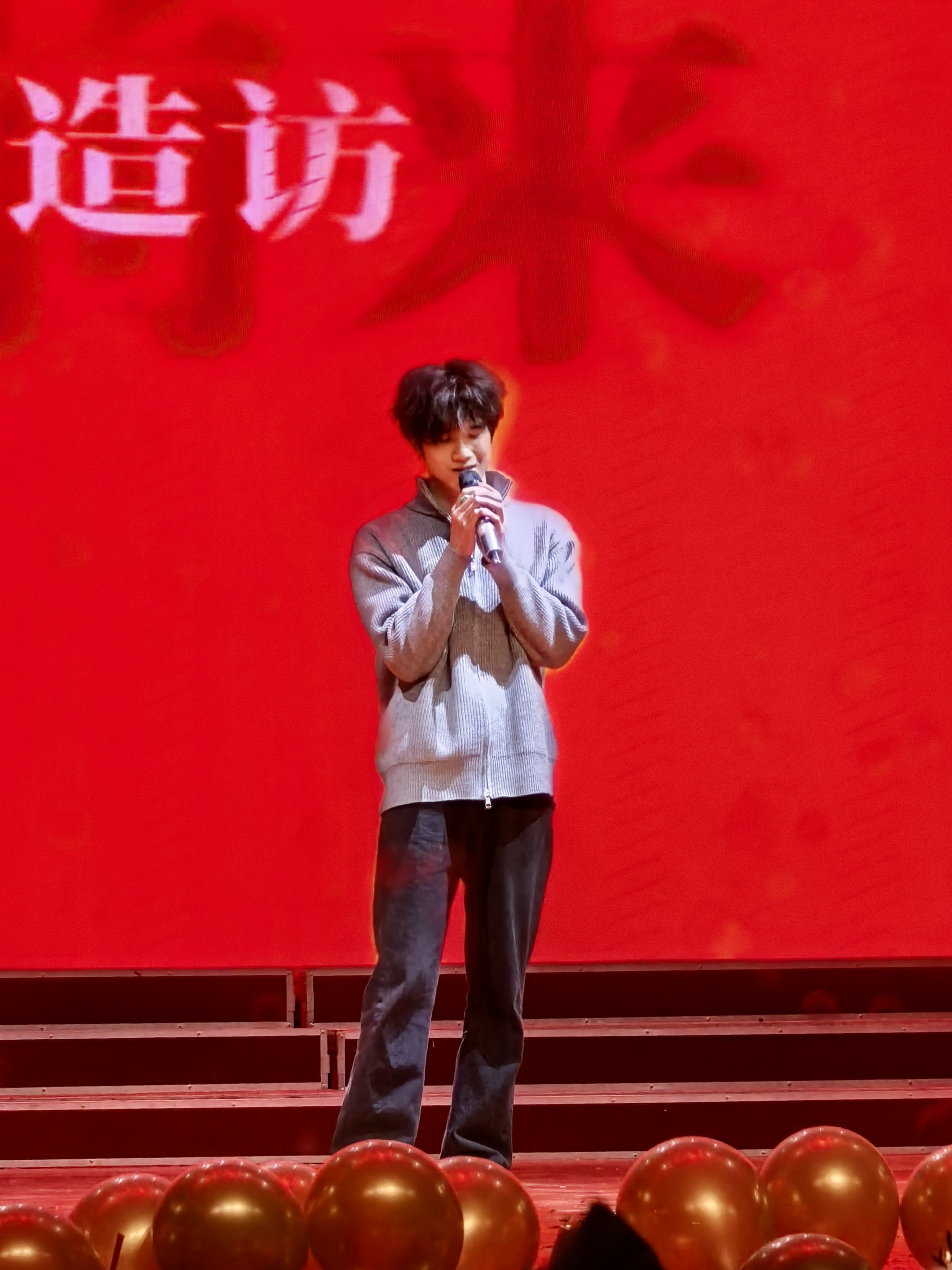 合唱《霜雪千午》古韵悠长,暖黄色追光落入舞台中央,清透的嗓音裹着冬日氛围感,现场化作一片温柔星海。一曲《落叶归根》深情款款,用醇厚的低音瞬间将观众带回深秋。《等你下课》《星空叙爱情》《我如此相信》唱出青春的悸动。